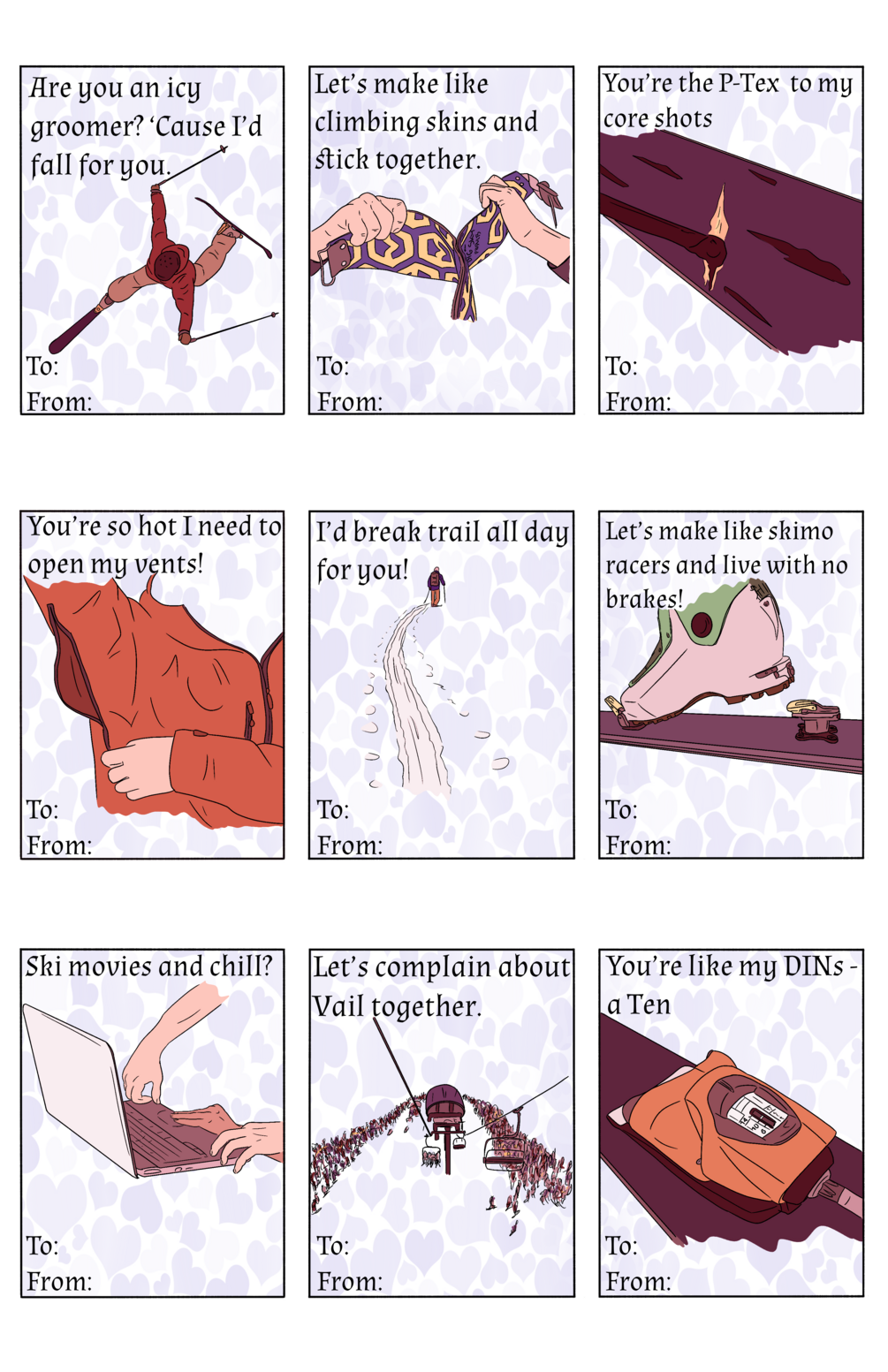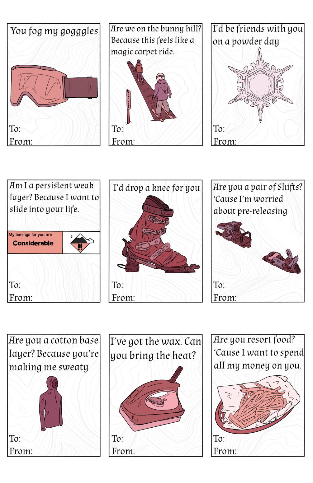 Downloadable print files for 18 skier-specific valentines. Woo your boo in style. Print 'em out, cut them out, hand 'em out. Results not guaranteed.